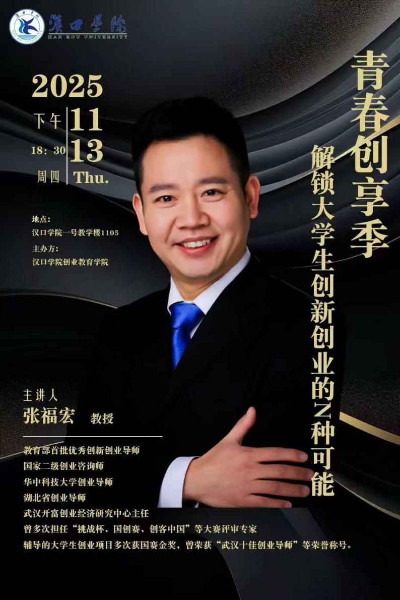机会来了!创业教育学院重磅推出【2025创新讲座】首场大师课,特邀“国赛金牌教练”张福宏教授空降汉院,手把手带你拆解从0到1的创新创业全链路!